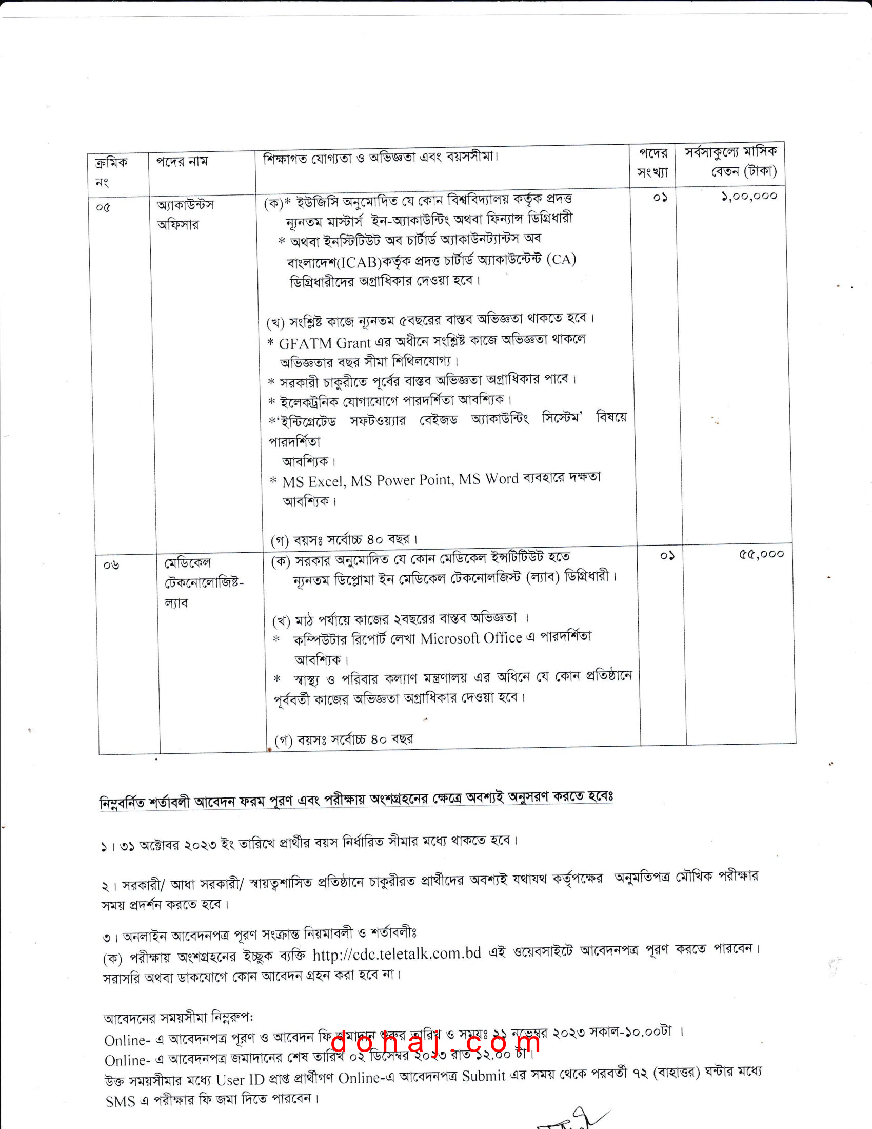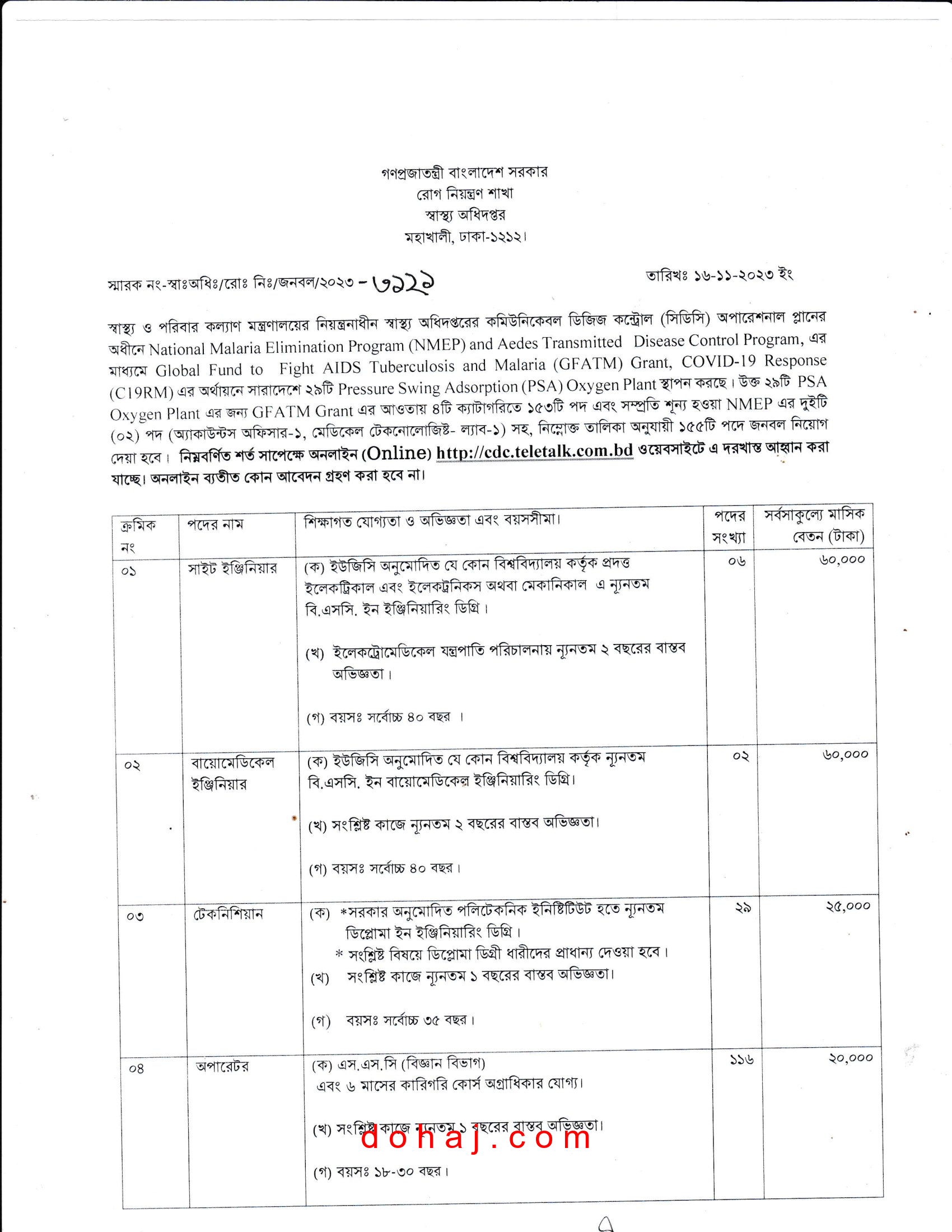 স্বাস্থ্য ও পরিবার কল্যাণ মন্ত্রণালয়ের নিয়ন্ত্রনাধীন স্বাস্থ্য অধিদপ্তরের কমিউনিকেবল ডিজিজ কন্ট্রোল (সিডিসি) অপারেশনাল প্লান এর শূন্য পদ সমূহে জনবল নিয়োগের বিজ্ঞপ্তি প্রকাশ করেছে। নতুন নিয়োগ বিজ্ঞপ্তি অনুসারে স্বাস্থ্য অধিদপ্তর ০৬ টি পদে মোট ১৫৫ জনকে নিয়োগ দেবে। পদগুলোতে নারী ও পুরুষ উভয়েই আবেদন করতে পারবেন। আগ্রহী প্রার্থীরা অনলাইনে আবেদন করতে পারবেন। এই চাকরিতে সকল জেলার প্রার্থীদের আবেদন করার সুযোগ আছে। সম্পূর্ণ বিজ্ঞপ্তি বিস্তারিত দেওয়া হল।