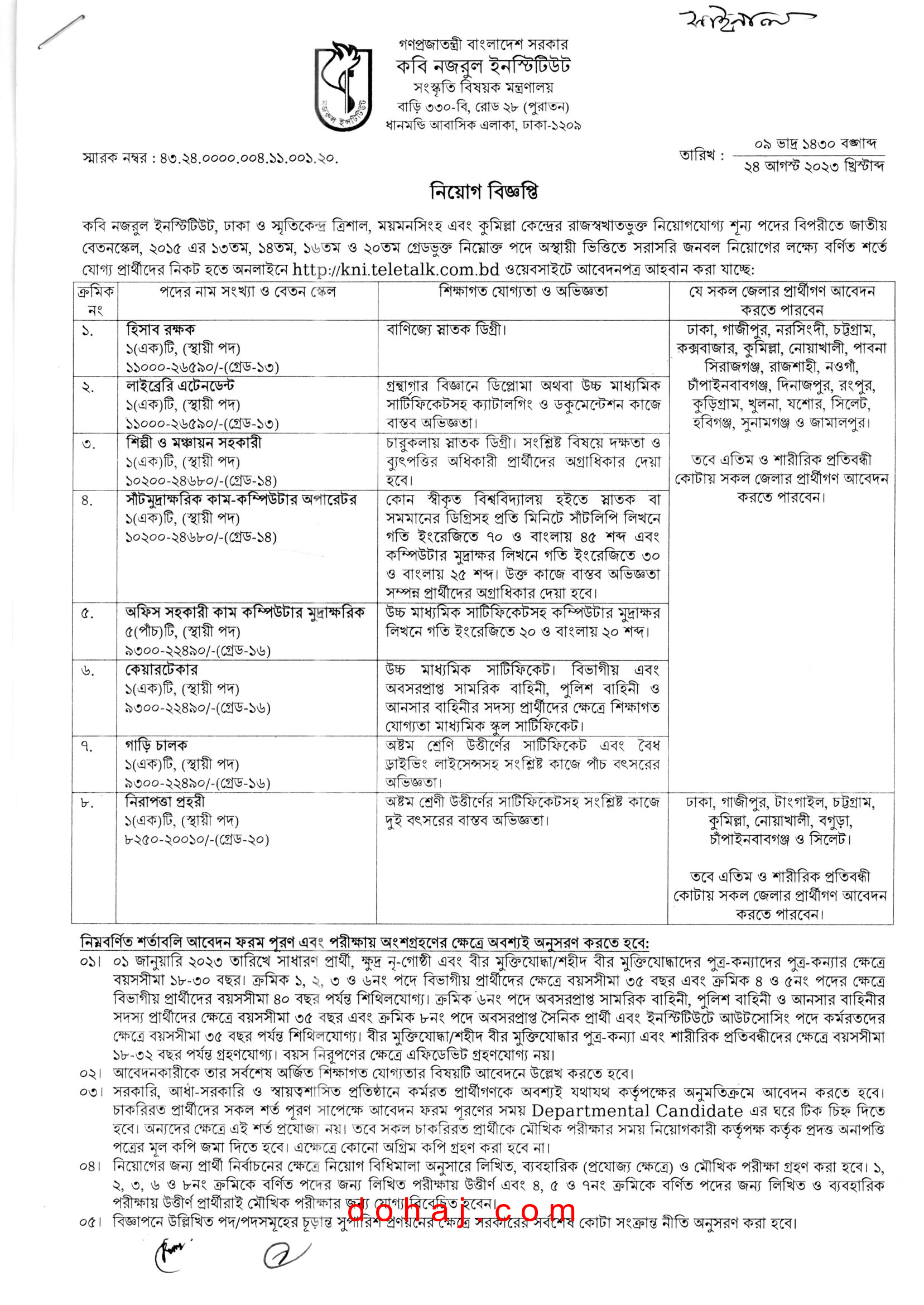সংস্কৃতি বিষয়ক মন্ত্রণালয়ের আওতাধীন কবি নজরুল ইনস্টিটিউট এর শূন্য পদসমূহে জনবল নিয়োগের জন্য নিয়োগ বিজ্ঞপ্তি প্রকাশ করেছে। সংস্কৃতি বিষয়ক মন্ত্রণালয় ০৮ টি পদে মোট ১২ জনকে নিয়োগ দেবে। আগ্রহী প্রার্থীরা অনলাইনে আবেদন করতে পারবেন। আগ্রহ ও যোগ্যতা থাকলে আপনিও আবেদন করতে পারেন। সম্পূর্ণ বিজ্ঞপ্তি বিস্তারিত দেওয়া হল।