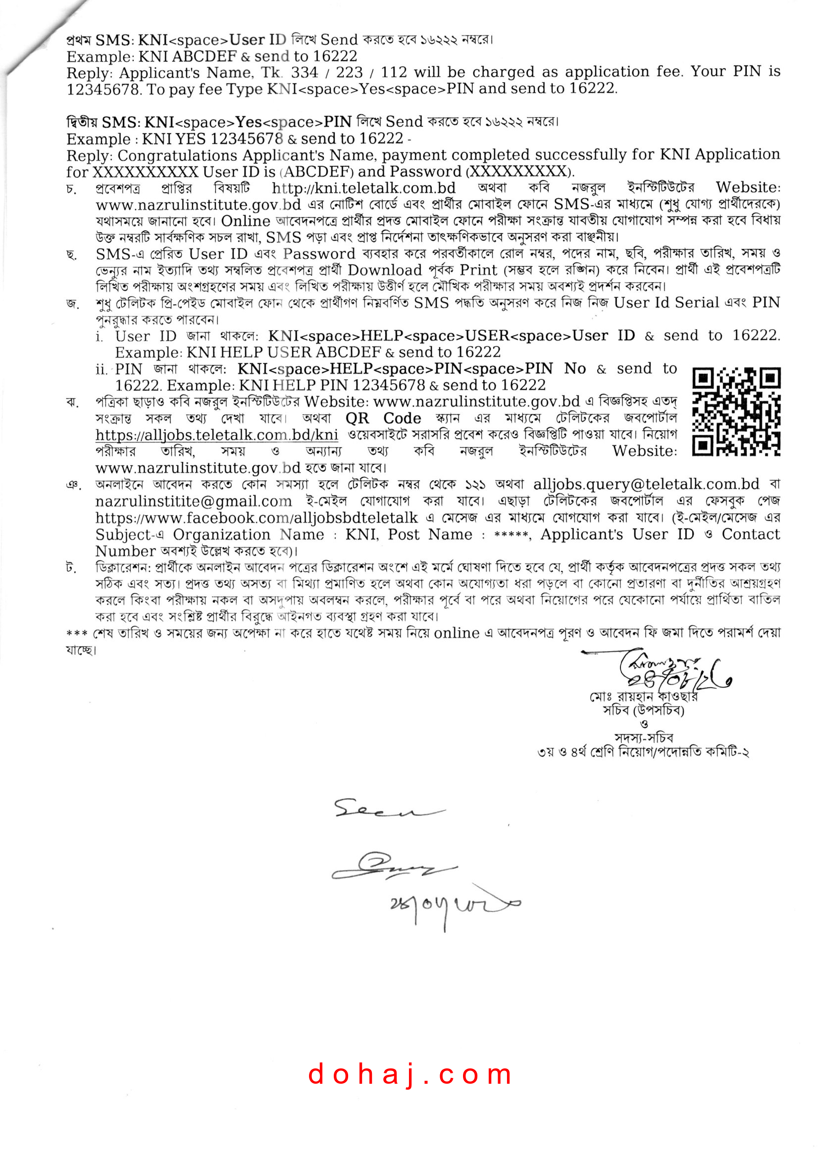 আবেদন প্রক্রিয়া: আবেদন করতে হবে অনলাইনে http://kni.teletalk.com.bd ওয়েবসাইটের মাধমে অনলাইনে আবেদনপত্র পাঠাতে হবে।