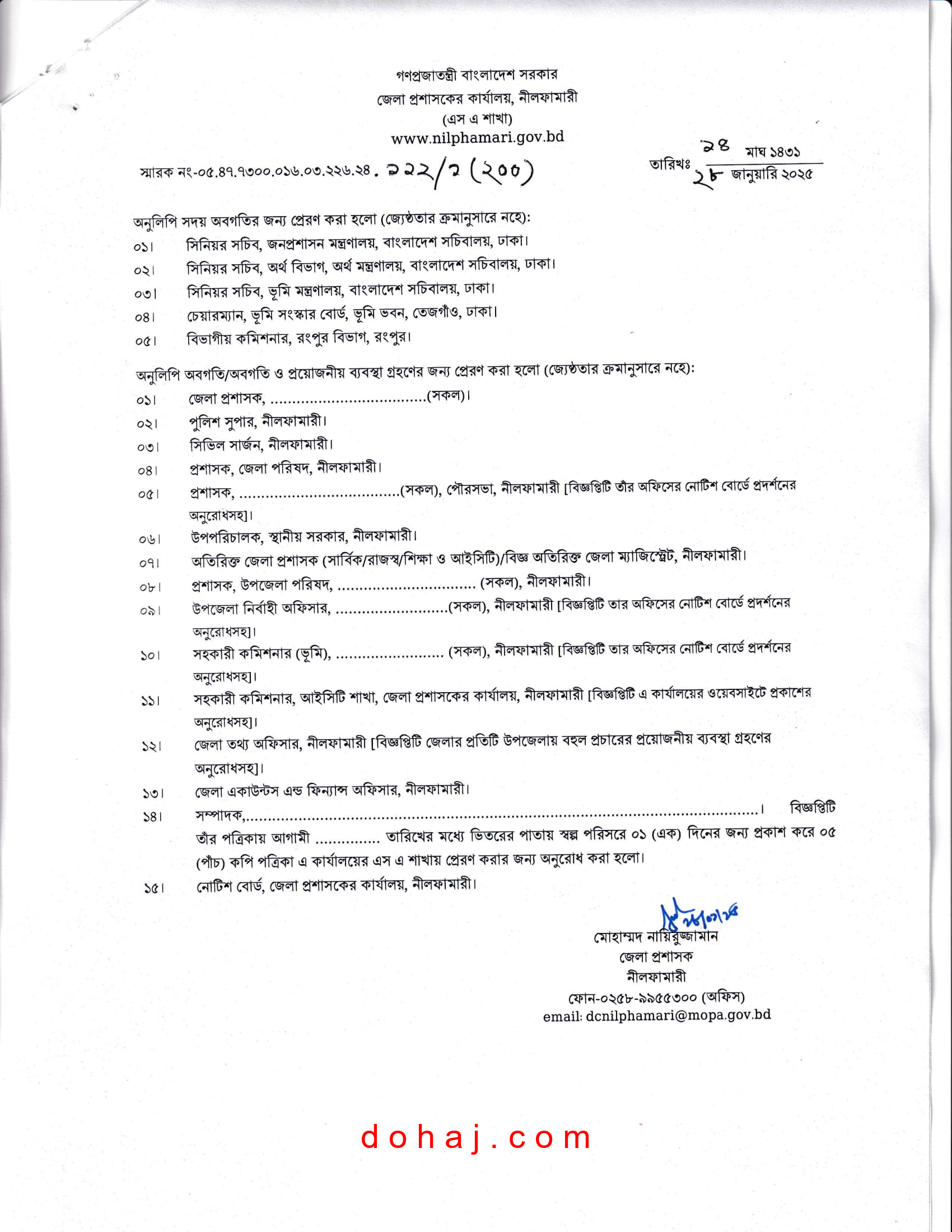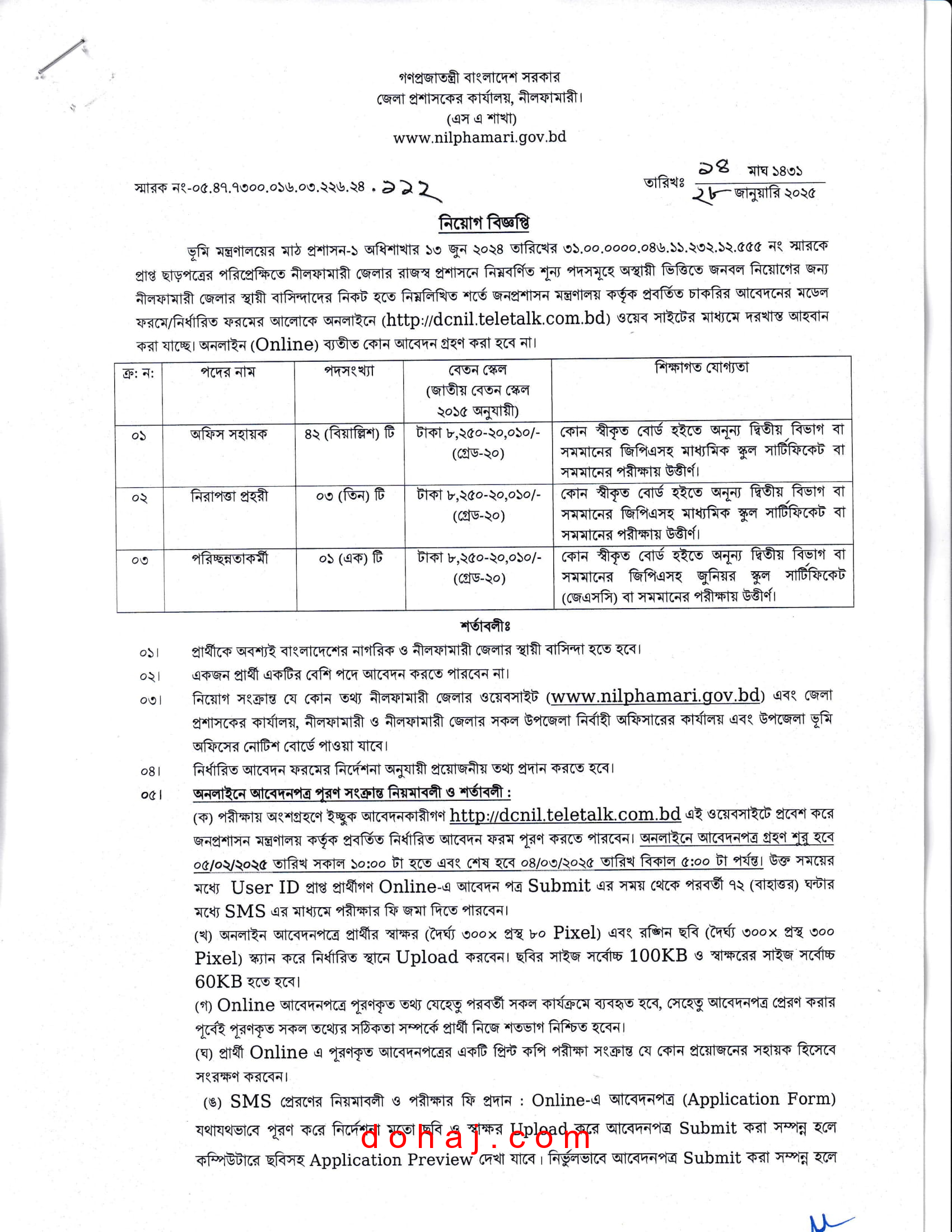 DC Office Job Circular 2025: নীলফামারী জেলা প্রশাসকের কার্যালয়ের শূন্য পদে লোক নিয়োগ দেয়া হবে। নীলফামারী জেলার প্রশাসকের কার্যালয় ০৩ টি পদে মোট ৪৬ জনকে নিয়োগ দেবে। এই চাকরিতে নীলফামারী জেলার স্থায়ী বাসিন্দারা শুধু আবেদন করতে পারবেন। পদগুলোতে নারী ও পুরুষ উভয়ই প্রার্থীরা আবেদন করতে পারবেন। সম্পূর্ণ বিজ্ঞপ্তি বিস্তারিত দেওয়া হল।