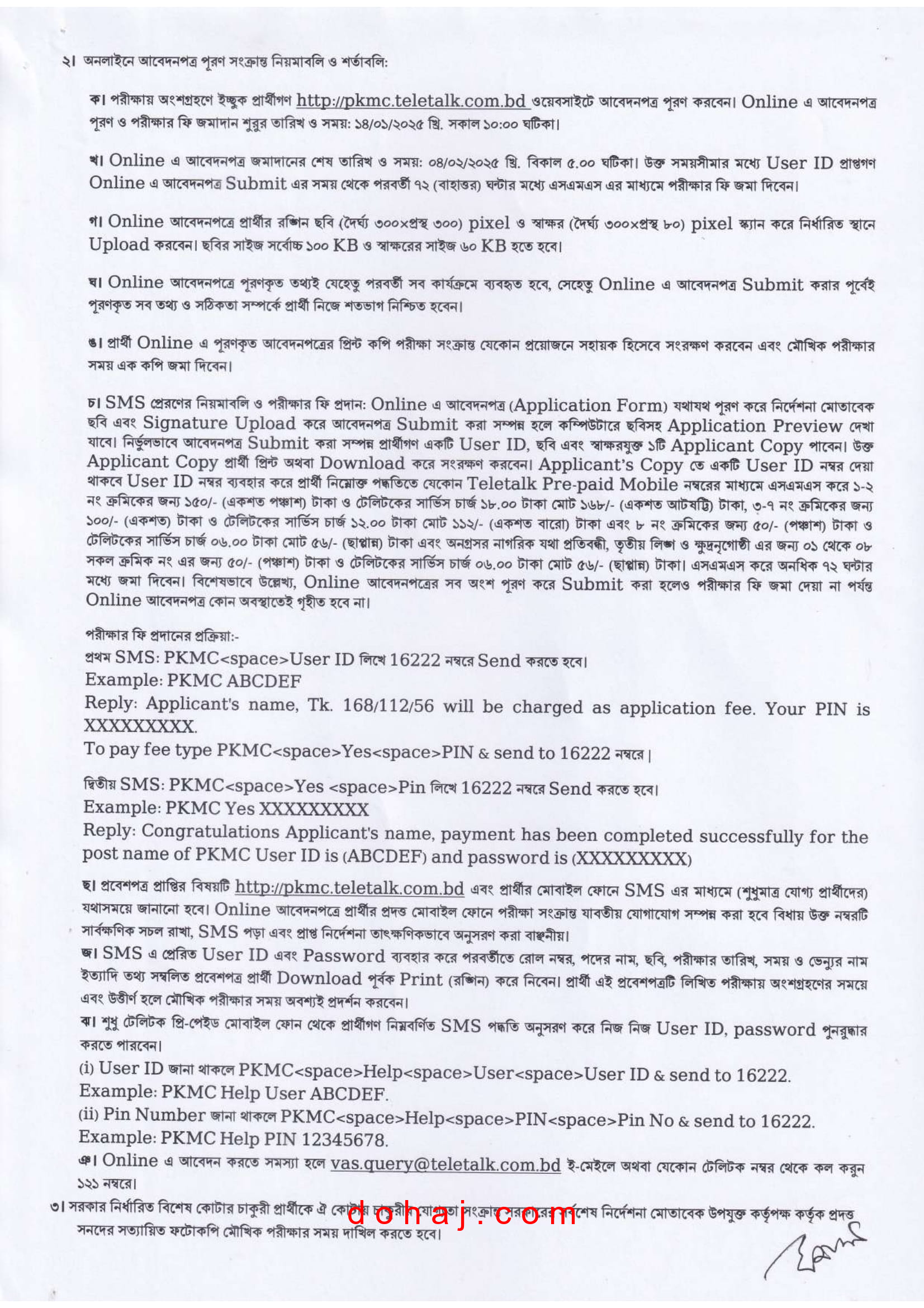 আবেদনের নিয়ম: আগ্রহী প্রার্থীরা অনলাইনে http://pkmc.teletalk.com.bd ওয়েবসাইটের মাধ্যমে আবেদন করতে পারবেন।
