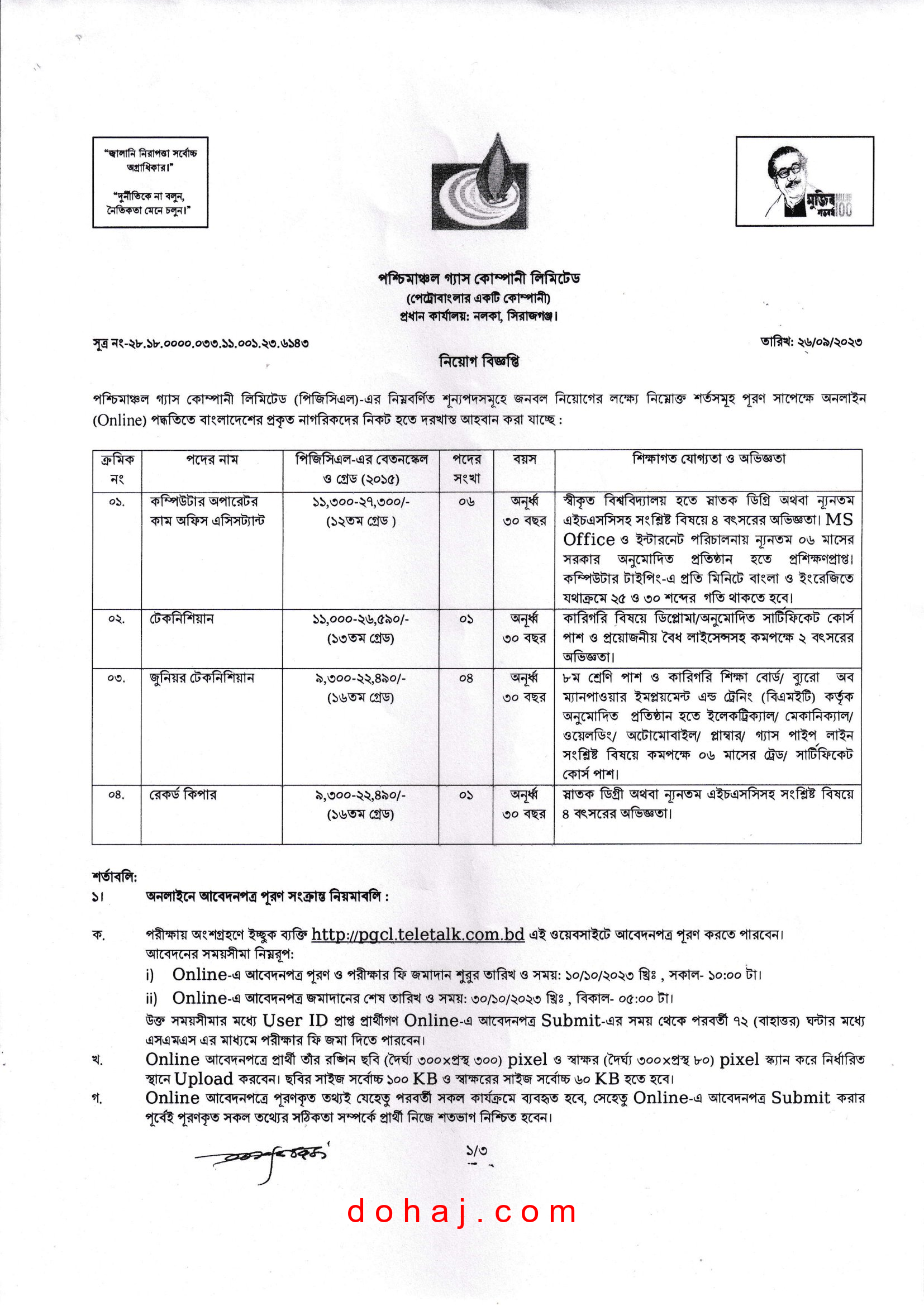 PGCL Job circular 2023: পশ্চিমাঞ্চল গ্যাস কোম্পানি (পিজিসিএল) এর শূন্য পদসমূহে জনবল নিয়োগ দেয়া হবে। পশ্চিমাঞ্চল গ্যাস কোম্পানি ০৪ টি পদে মোট ১২ জনকে নিয়োগ দেয়া হবে। পদগুলোতে নারী ও পুরুষ উভয়েই আবেদন করতে পারবেন। আগ্রহী প্রার্থীরা অনলাইনে আবেদন করতে পারবেন। আগ্রহ ও যোগ্যতা থাকলে আপনিও আবেদন করতে পারেন। সম্পূর্ণ বিজ্ঞপ্তি বিস্তারিত দেওয়া হল।