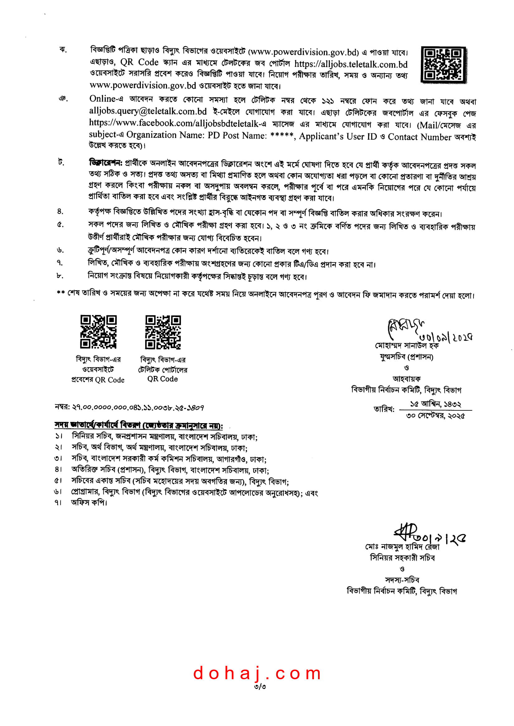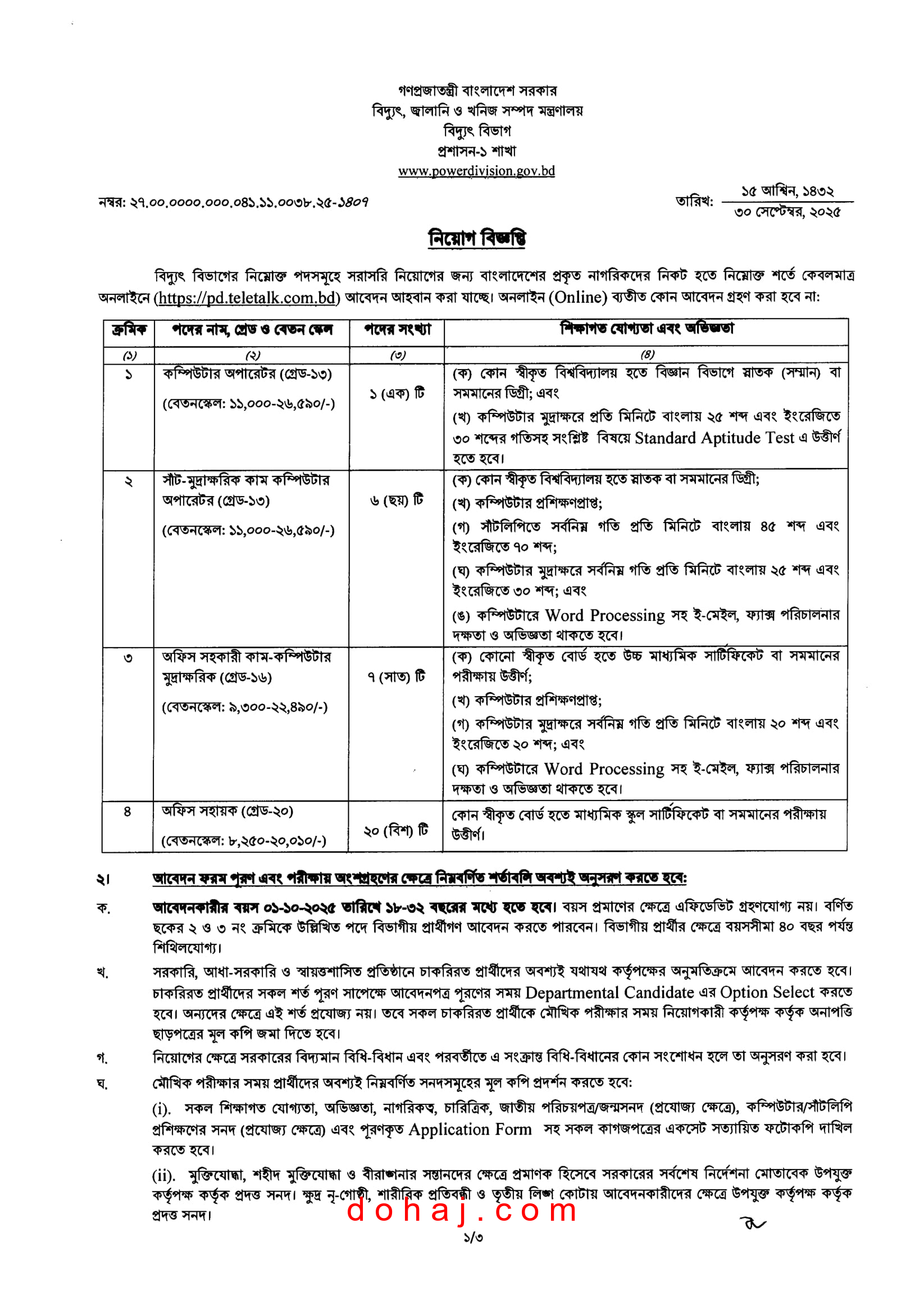 Power Division Job Circular 2025: বিদ্যুৎ বিভাগ কর্তৃপক্ষ এর শূন্য পদসমূহে সরাসরি জনবল নিয়োগ দেয়া হবে। বিদ্যুৎ বিভাগ কর্তৃপক্ষ ০৪ টি পদে মোট ৩৪ জনকে নিয়োগ দেবে। পদগুলোতে নারী ও পুরুষ উভয়েই আবেদন করতে পারবেন। আগ্রহী প্রার্থীরা অনলাইনে আবেদন করতে পারবেন। আগ্রহ ও যোগ্যতা থাকলে আপনিও আবেদন করতে পারেন। সম্পূর্ণ বিজ্ঞপ্তি বিস্তারিত দেওয়া হল।