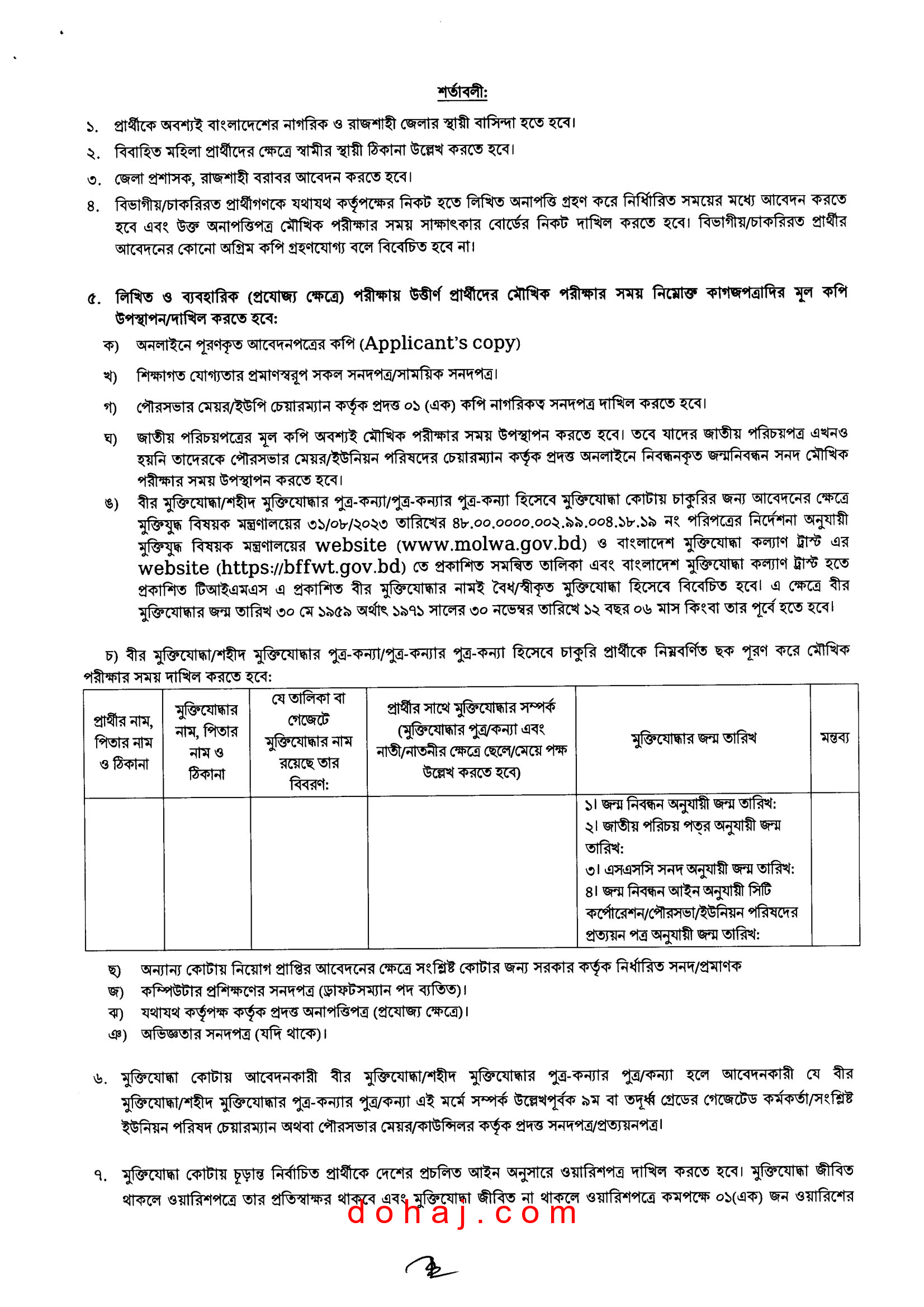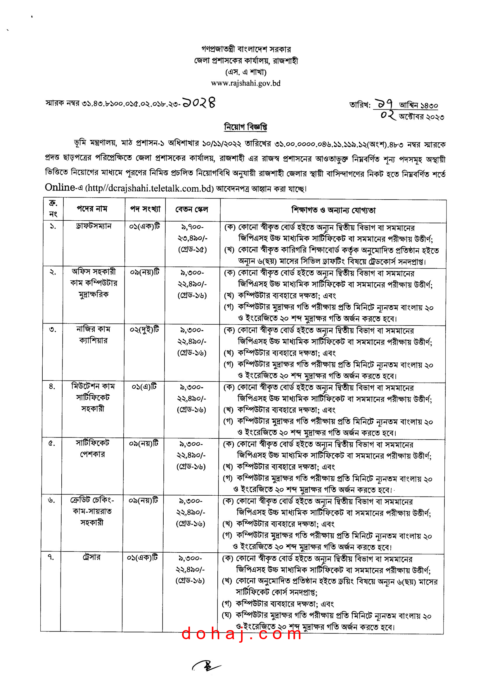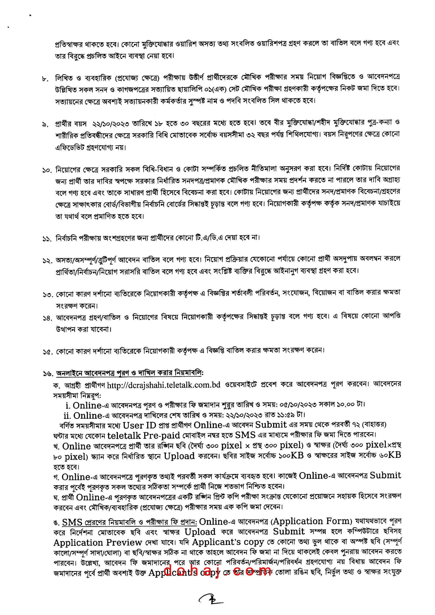 আবেদন প্রক্রিয়া: আবেদন করতে হবে অনলাইনে http://dcrajshahi.teletalk.com.bd ওয়েবসাইটের মাধমে অনলাইনে আবেদনপত্র পাঠাতে হবে।