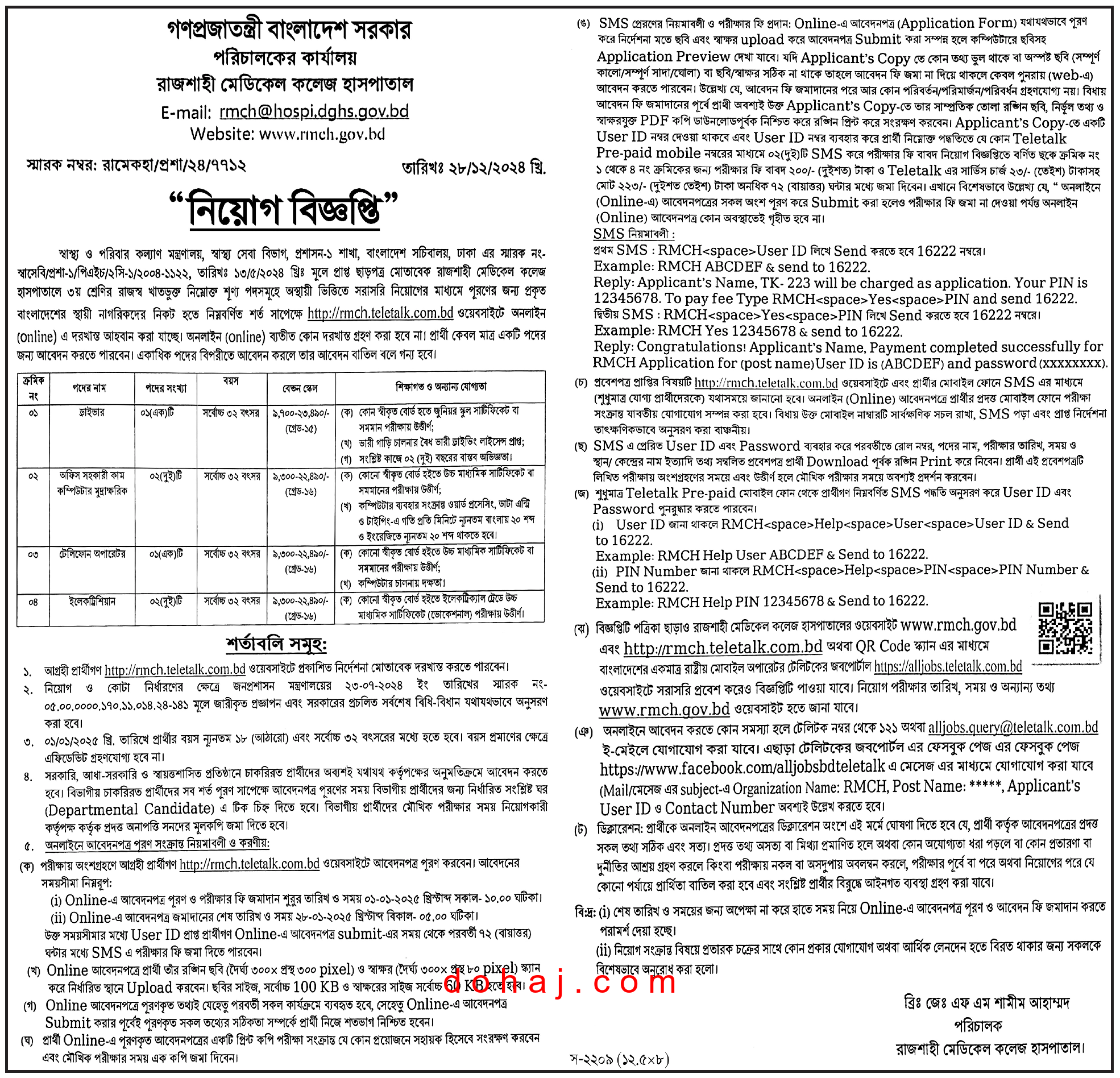 আবেদনের নিয়ম: আগ্রহী প্রার্থীরা অনলাইনে http://rmch.teletalk.com.bd ওয়েবসাইটের মাধ্যমে আবেদন করতে পারবেন।