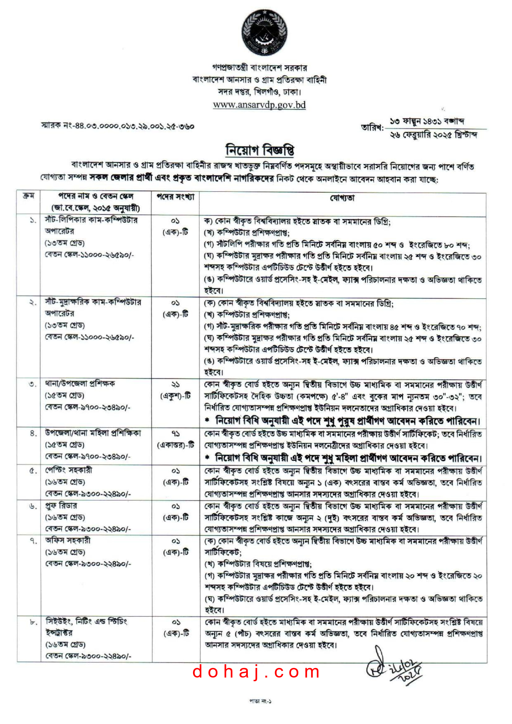 অন্যান্য যোগ্যতা: দৈহিক উচ্চতা (কমপক্ষে) ৫-২, তবে নির্ধারিত যোগ্যতাসম্পন্ন প্রশিক্ষণপ্রাপ্ত আনসার সদস্যাদের অগ্রাধিকার দেওয়া হইবে।