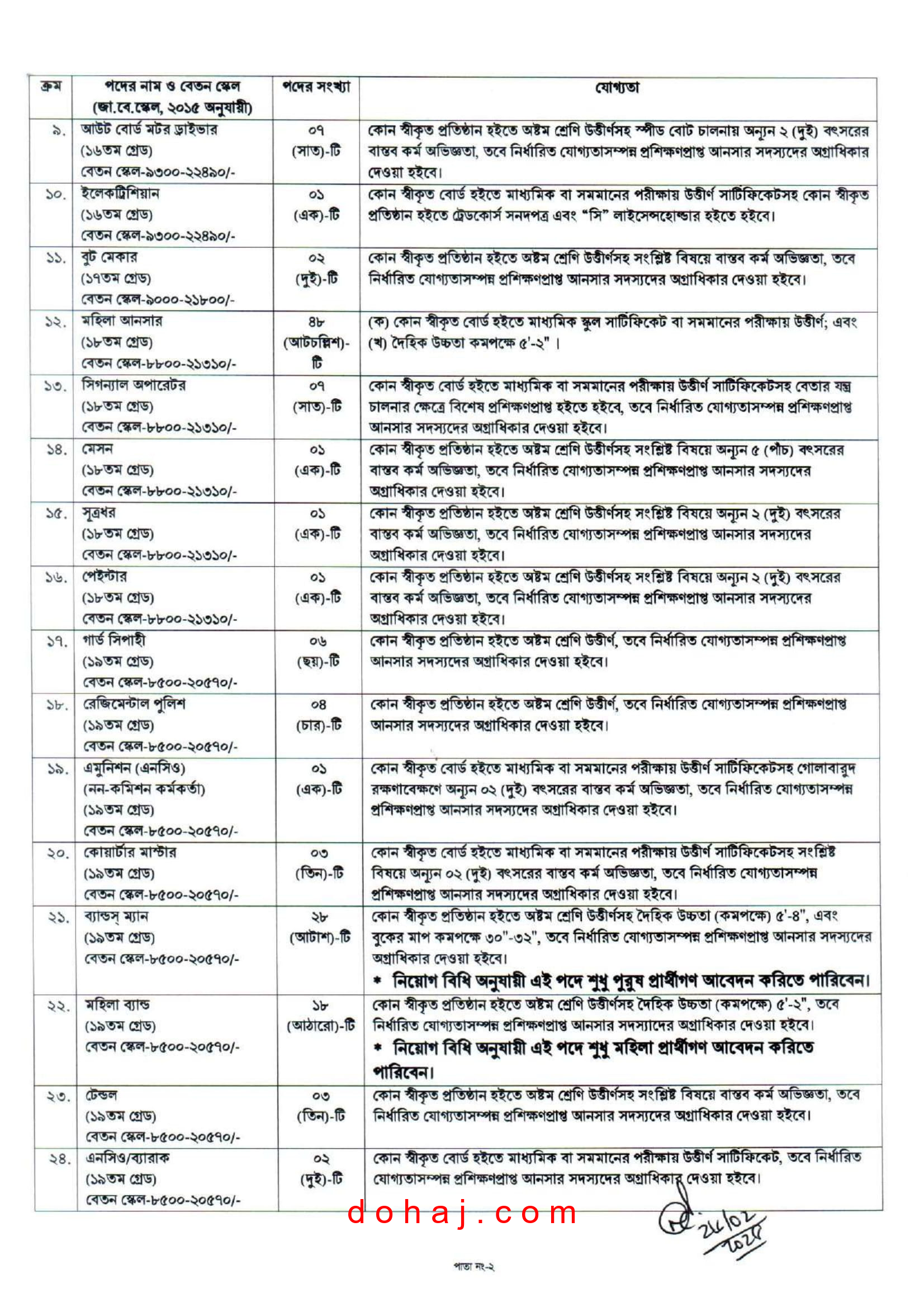 শিক্ষাগত যোগ্যতা: কোনো স্বীকৃত বোর্ড হইতে অষ্টম শ্রেণি বা জুনিয়র স্কুল সার্টিফিকেট বা সমমানের কোনো পরীক্ষায় উত্তীর্ণ