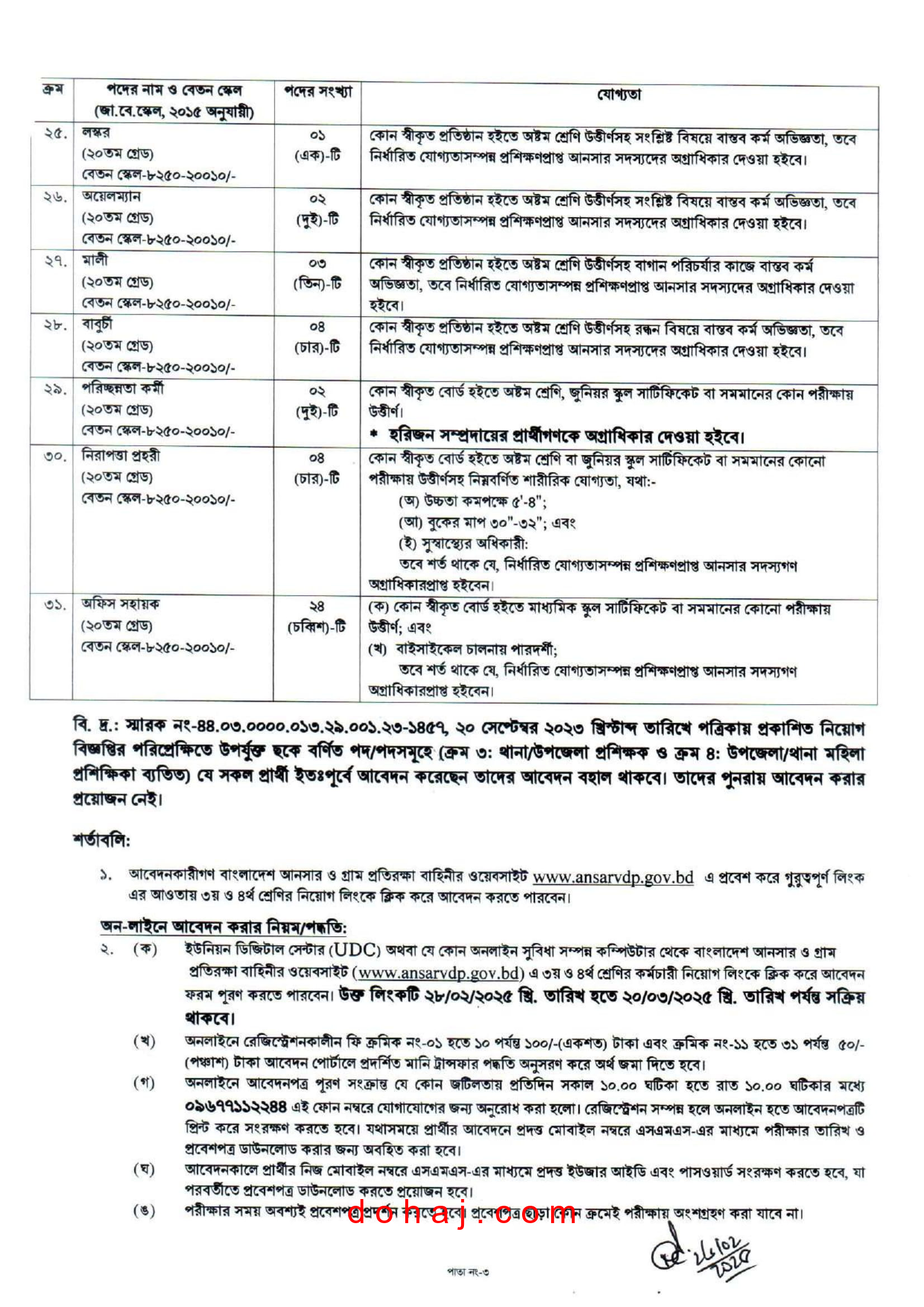 আবেদনের নিয়ম: ইউনিয়ন ডিজিটাল সেন্টার অথবা যে কোনও অন-লাইন সুবিধা সম্পন্ন কম্পিউটার থেকে আনসার ও গ্রাম প্রতিরক্ষা বাহিনীর ওয়েব সাইট (www.ansarvdp.gov.bd) এ প্রবেশ করে গুরুত্বপূর্ণ লিংক এর আওতায় ৩য়/৪র্থ শ্রেণীর নিয়োগ লিংকে ক্লিক করে আবেদনপত্র পূরণ করে দাখিল করা যাবে।