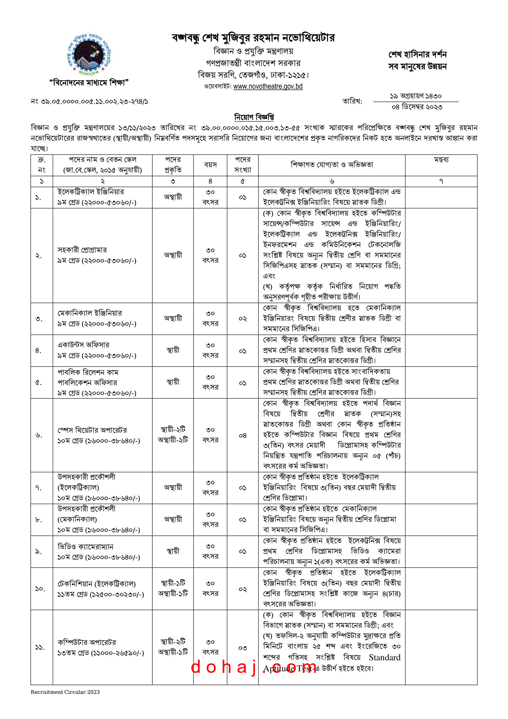 বিজ্ঞান ও প্রযুক্তি মন্ত্রণালয়ের বঙ্গবন্ধু শেখ মুজিবুর রহমান নভোথিয়েটার স্থায়ী শূন্য পদসমূহে জনবল নিয়োগ দেবে। বঙ্গবন্ধু শেখ মুজিবুর রহমান নভোথিয়েটার ১৬টি পদে মোট ৩০ জনকে নিয়োগ দেবে। সকল জেলার আগ্রহী প্রার্থীরা অনলাইনে আবেদন করতে পারবেন। আগ্রহ ও যোগ্যতা থাকলে আপনিও আবেদন করতে পারেন। সম্পূর্ণ বিজ্ঞপ্তি বিস্তারিত দেওয়া হল।