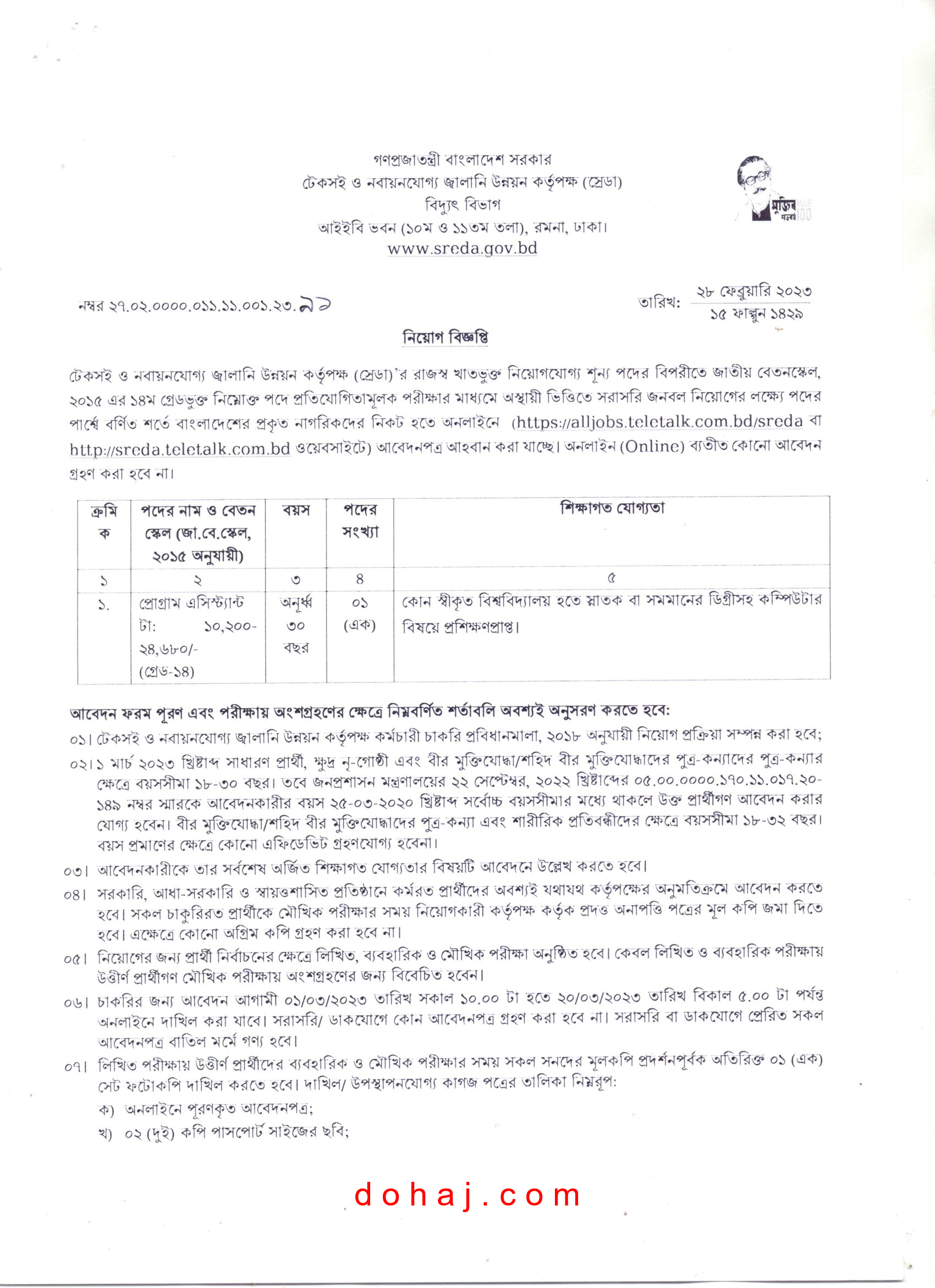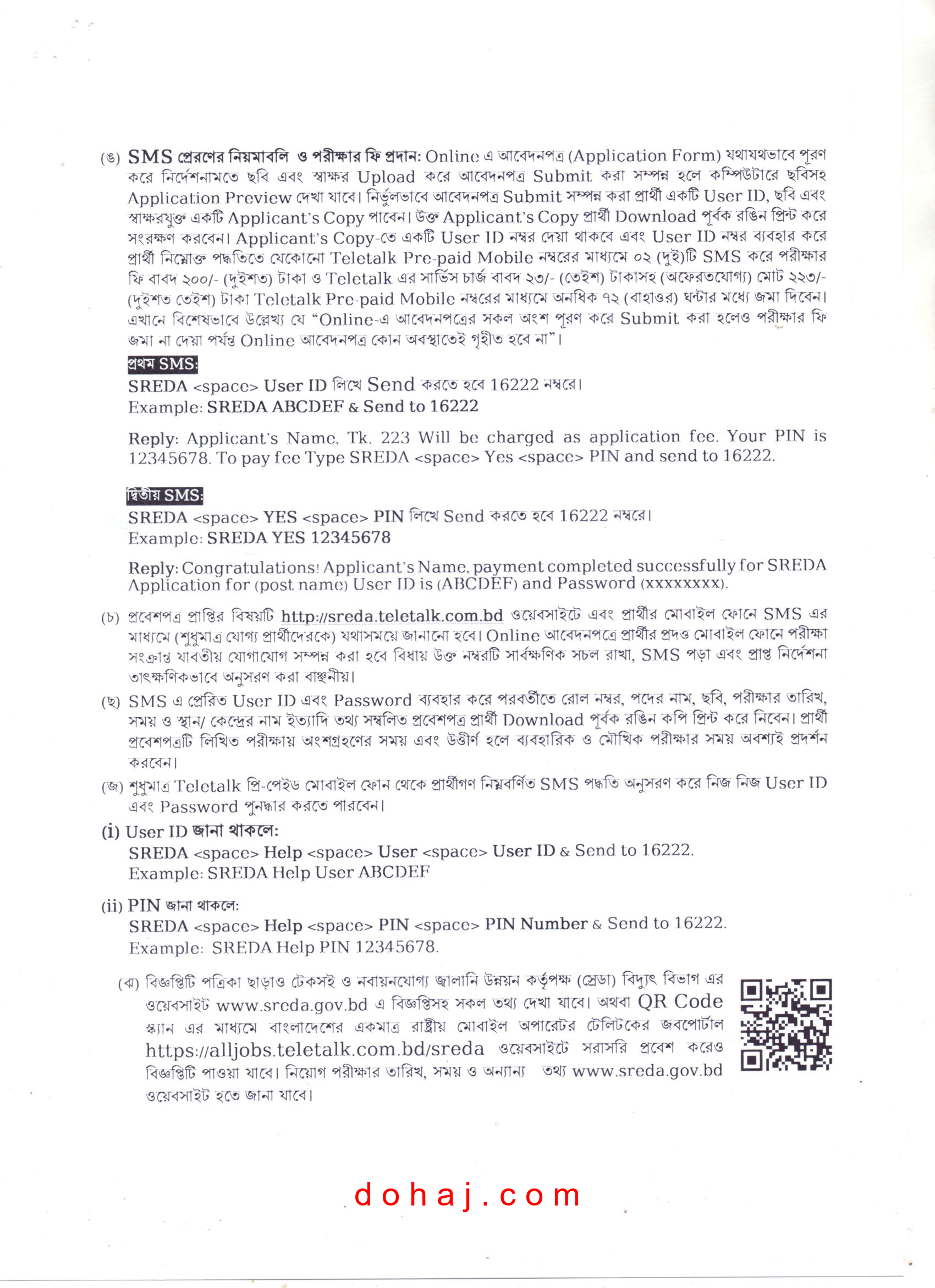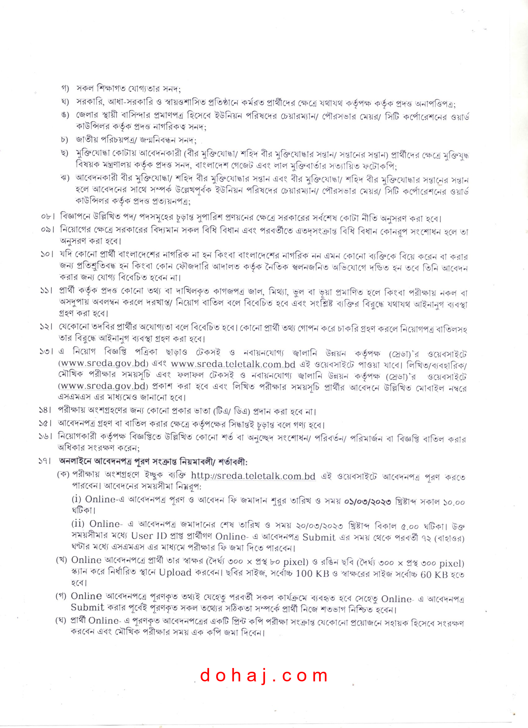 আবেদন প্রক্রিয়া: আগ্রহী প্রার্থীরা অনলাইনে http://sreda.teletalk.com.bd এই ওয়েবসাইটে গিয়ে আবেদনপত্র পূরণ করতে পারবেন।