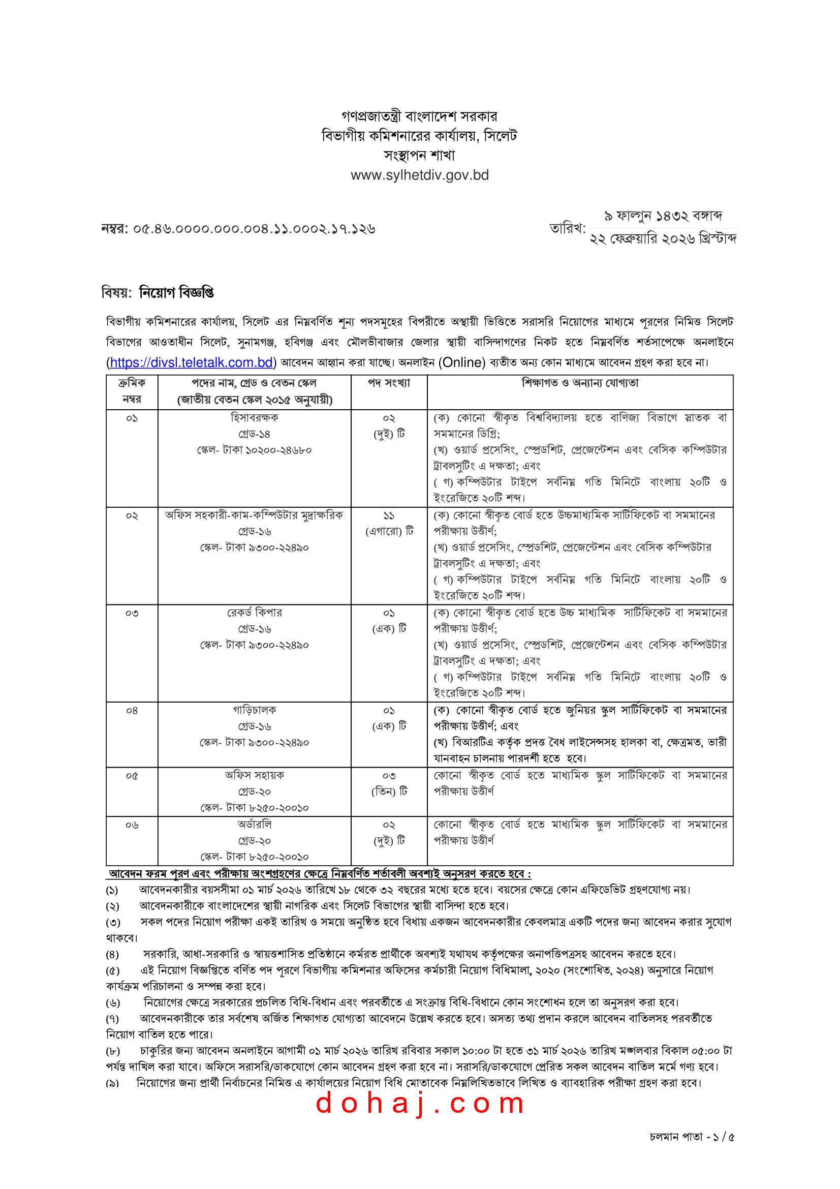 Sylhet Divisional Commissioner’s Office Job Circular 2026: বিভাগীয় কমিশনারের কার্যালয়, সিলেট এর শূন্য পদসমূহে জনবল নিয়োগের বিজ্ঞপ্তি প্রকাশ হয়েছে। সিলেট বিভাগীয় কমিশনারের কার্যালয় ০৬ টি পদে মোট ২০ জনকে নিয়োগ দেবে। পদগুলোতে নারী ও পুরুষ উভয়ই প্রার্থীরা আবেদন করতে পারবেন। আগ্রহী প্রার্থীরা অনলাইনে আবেদন করতে পারবেন। আগ্রহ ও যোগ্যতা থাকলে আপনিও আবেদন করতে পারেন। সম্পূর্ণ বিজ্ঞপ্তি বিস্তারিত দেওয়া হল।