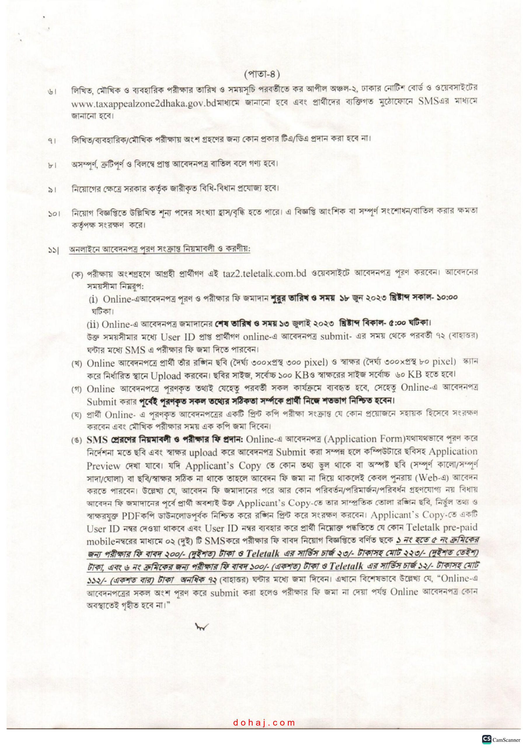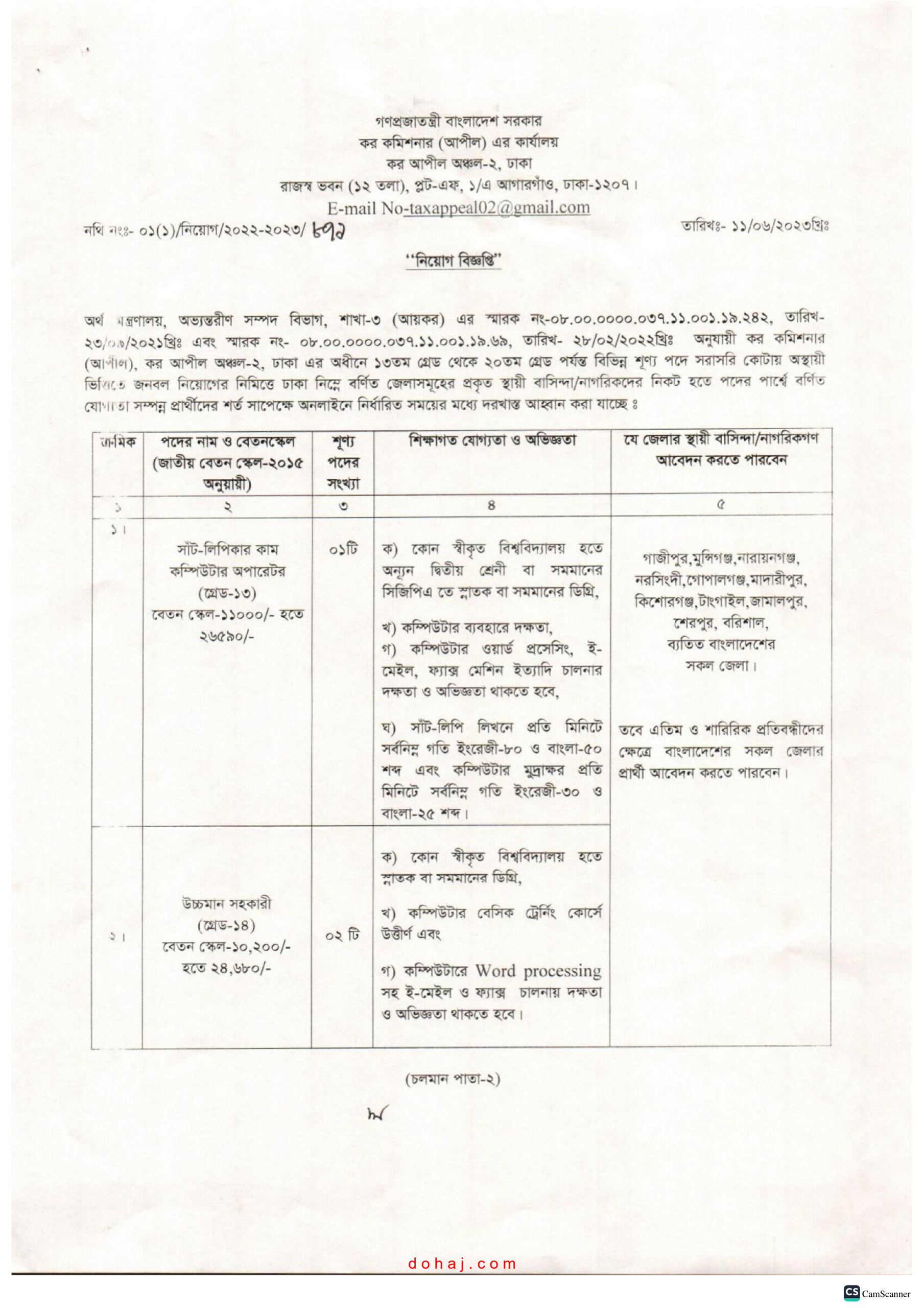 Tax commissioner (appeal) office job circular 2023: গণপ্রজাতন্ত্রী বাংলাদেশ সরকার অর্থ মন্ত্রণালয় অভ্যন্তরীণ সম্পদ বিভাগ থেকে কর কমিশনের নিয়োগ বিজ্ঞপ্তি প্রকাশ হয়েছে। কর আপীল অঞ্চল-২, ঢাকা এর অধীনে ০৬টি পদে মোট ০৮ জনকে নিয়োগ দেবে। পদগুলোতে নারী ও পুরুষ উভয়েই আবেদন করতে পারবেন। আগ্রহী প্রার্থীরা অনলাইনে আবেদন করতে পারবেন। সম্পূর্ণ বিজ্ঞপ্তি বিস্তারিত দেওয়া হল। সরকারি বেসরকারি সকল চাকরির খবর সবার আগে পড়তে আমাদের চাকরির খবর পেজে বিজিট করুন।