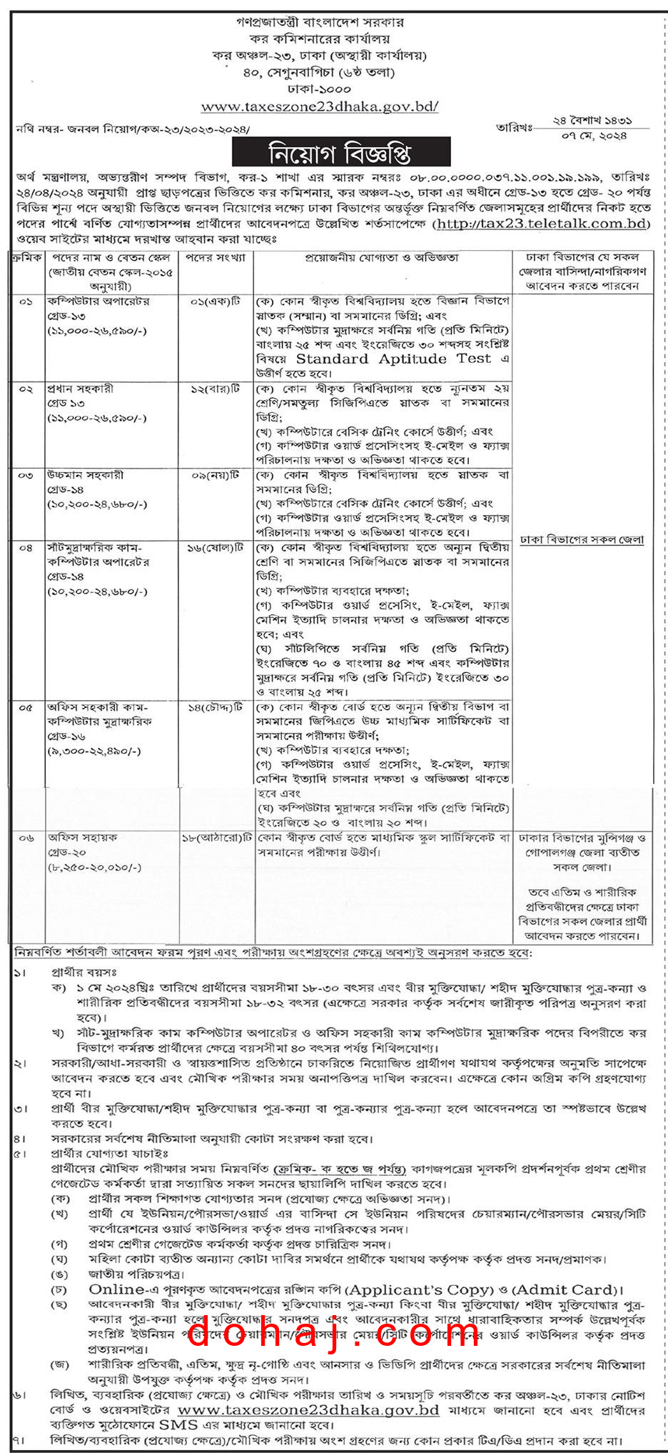 কর কমিশনারের কার্যালয়, কর অঞ্চল-২৩, ঢাকা এর অধীনে ০৬ টি পদে মোট ৭০ জনকে নিয়োগ দেবে। পদগুলোতে নারী ও পুরুষ উভয়েই আবেদন করতে পারবেন। আগ্রহী প্রার্থীরা অনলাইনে আবেদন করতে পারবেন। এই চাকরিতে ঢাকা বিভাগের সকল জেলা প্রার্থীরা আবেদন করতে পারবেন। সম্পূর্ণ বিজ্ঞপ্তি বিস্তারিত দেওয়া হল।