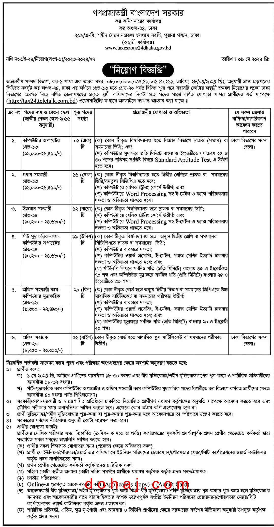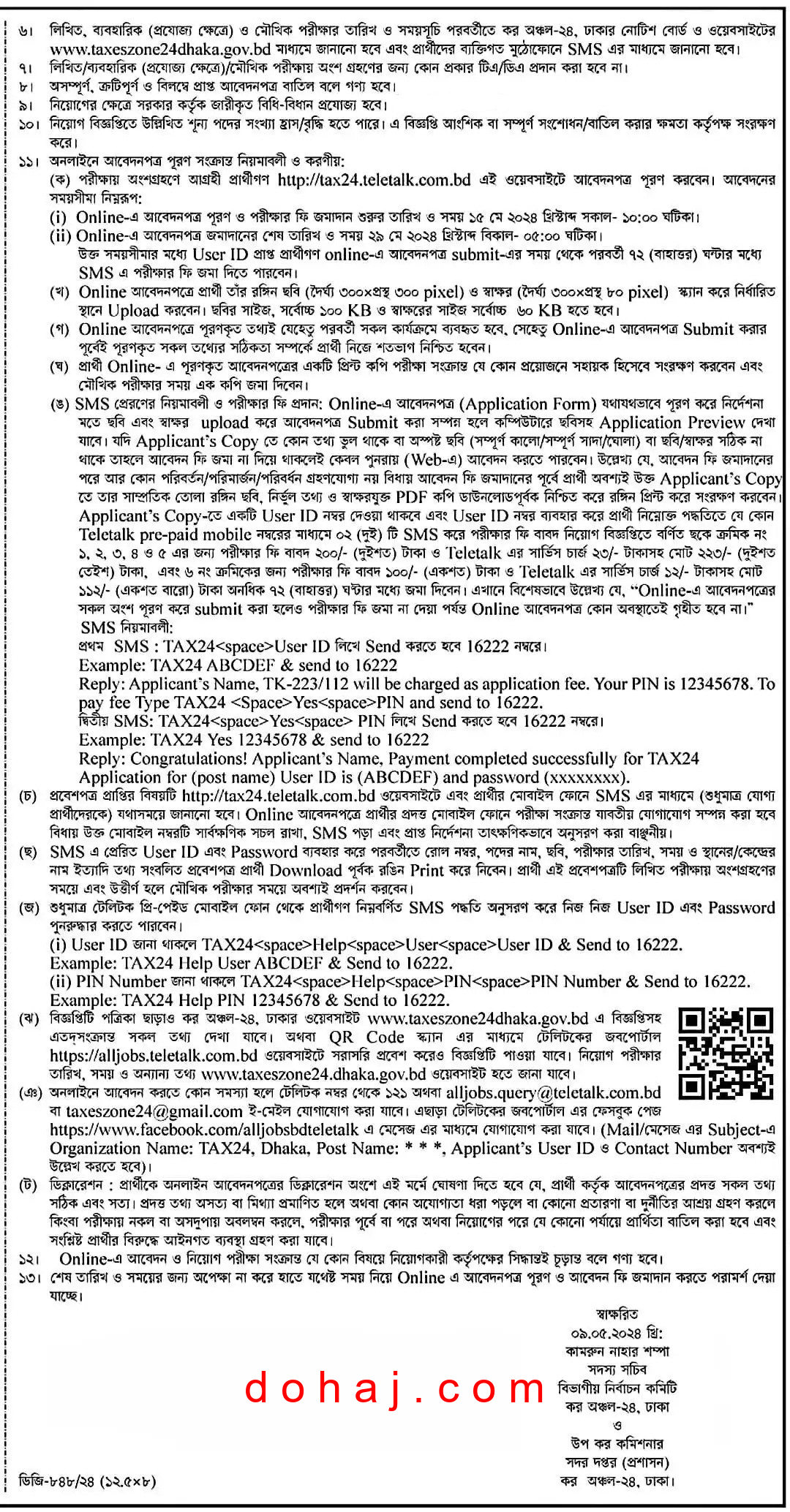 আবেদন প্রক্রিয়া: আগ্রহী প্রার্থীরা অনলাইনে http://tax24.teletalk.com.bd এই ওয়েবসাইটে গিয়ে আবেদনপত্র পূরণ করতে পারবেন।