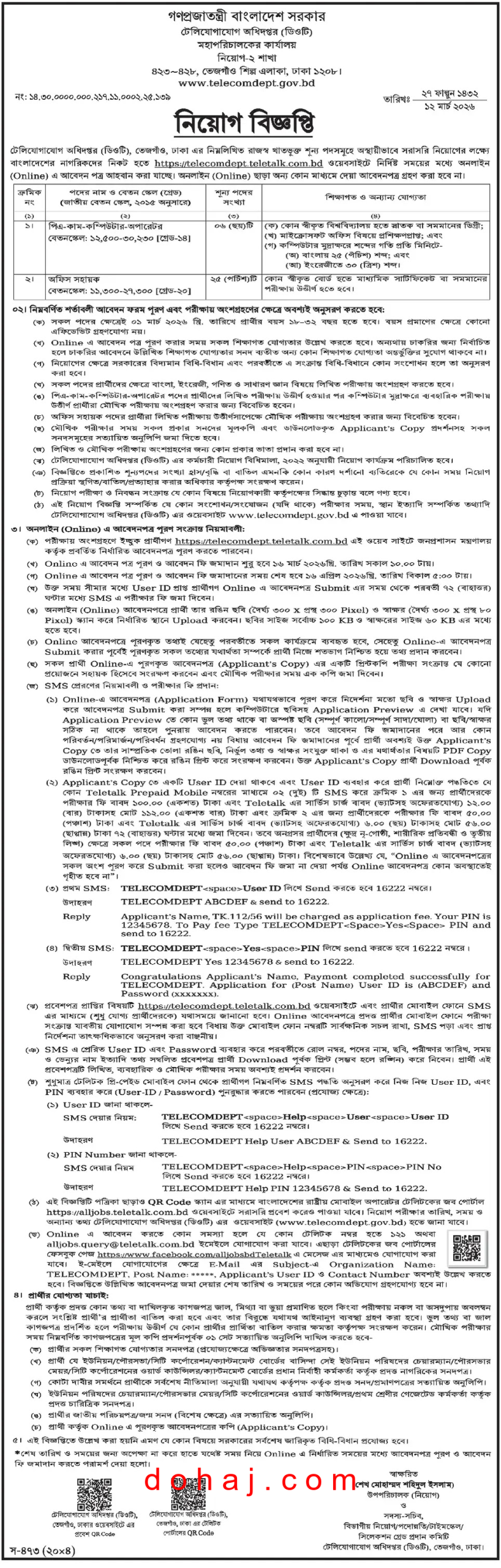 আবেদন প্রক্রিয়া: আবেদন করতে হবে অনলাইনে http://telecomdept.teletalk.com.bd ওয়েবসাইটের মাধমে অনলাইনে আবেদনপত্র পাঠাতে হবে।