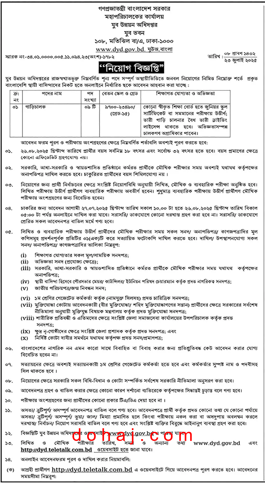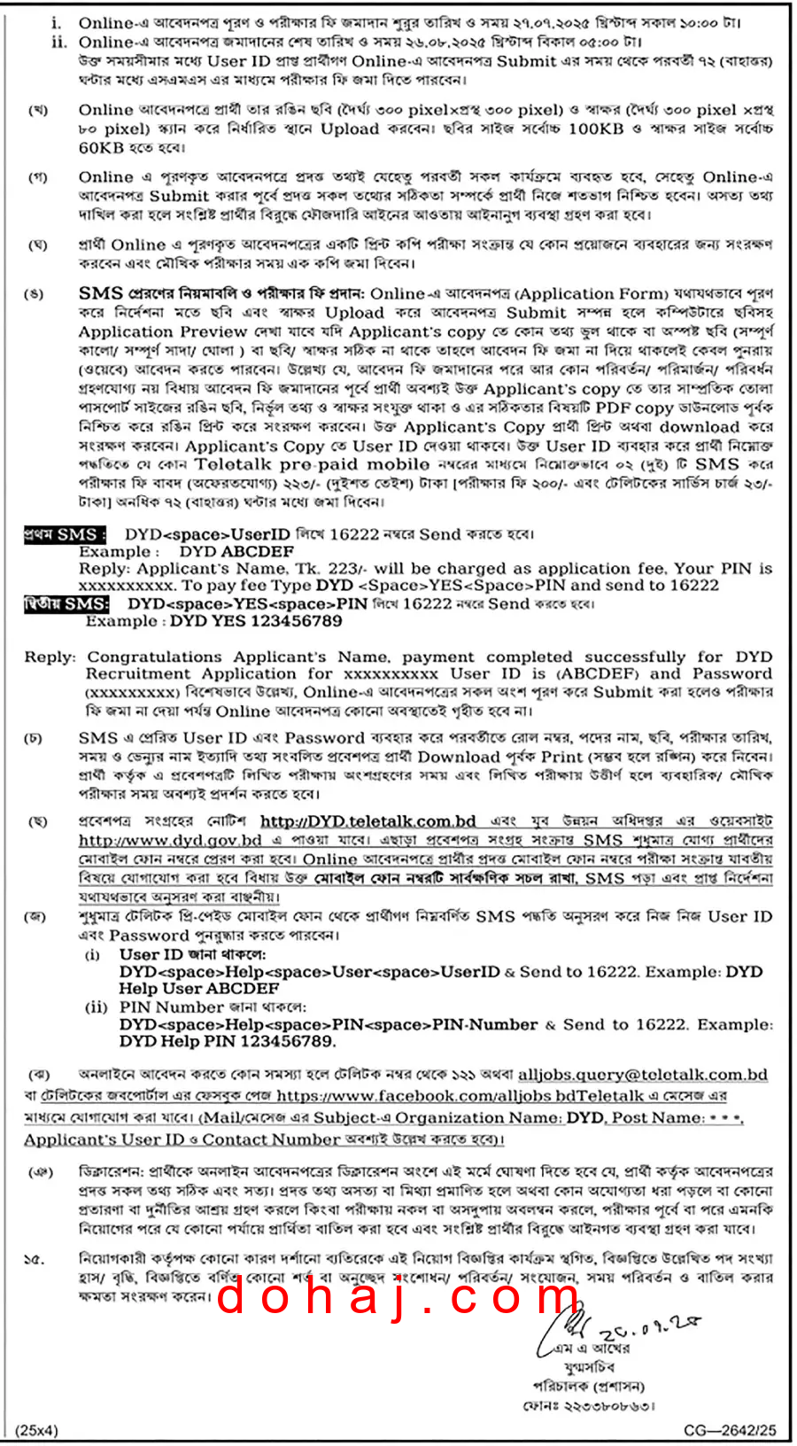 আবেদন প্রক্রিয়া: আগ্রহী প্রার্থীরা অনলাইনে http://dyd.teletalk.com.bd এই ওয়েবসাইটে গিয়ে আবেদনপত্র পূরণ করতে পারবেন।